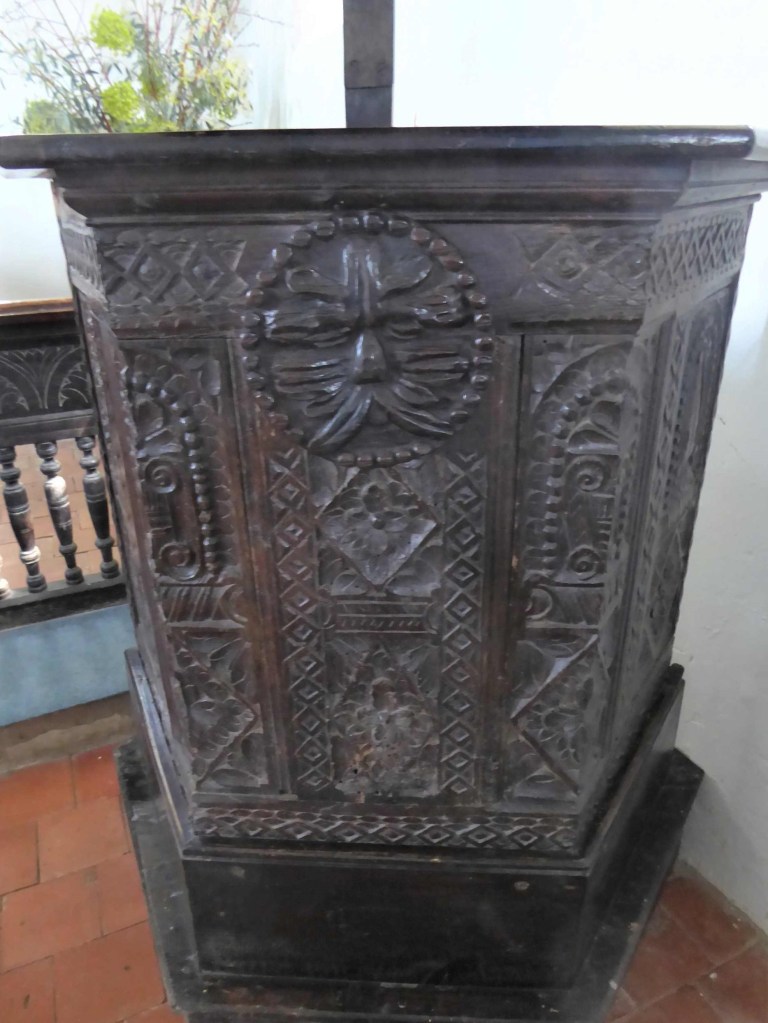 It looks Jacobean, and indeed was likely made out of an old Jacobean chest, by a later Rector. The more modern ‘Green Man’ carved disc on the front was added later, to disguise the keyhole on the front! Again, there’s no opportunity for a nervous preacher to hide – his flock is right there, within touching distance, and it seems quite possible that for many centuries there was no pulpit at all. Right at the back is the most modern addition – a tiny vestry. In centuries gone by, we can imagine the priest robing in the village and striding up to the church with his congregation.